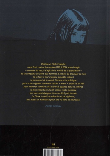 Entre le documentaire et l'autobiographie, le choix c'est l' épopée de la lutte féminine pour le droit à l'avortement et à la contraception. " Désirée et Alain Frappier nous font revivre les années 1970 à 2014 sous l'angle de la conquête du droit des femmes à choisir de procréer ou non. Ils le font à leur manière sensible, mêlant le personnel et le social, l'intime et le politique pour nous rappeler comment c'était " avant ", avant la loi Veil, pour montrer combien cette liberté, gagnée dans le combat le plus important du XXe siècle, reste menacée par des nostalgiques d'une société Le Choix, travail de mémoire et de vigilance, est aussi un manifeste pour une vie libre et heureuse. " Annie Ernaux " La sensibilité au discours des Frappier est sans conteste décuplée par les images, qui remuent chacun d'entre nous, parfois jusqu'aux tripes. C'est dire tout ce que la bande dessinée a à apporter aux sciences sociales, bien au-delà de ses qualités documentaires et historiques, parce qu'elle est oeuvre, tout simplement. " Gabrielle Napoli, les filles du Loire, 2015