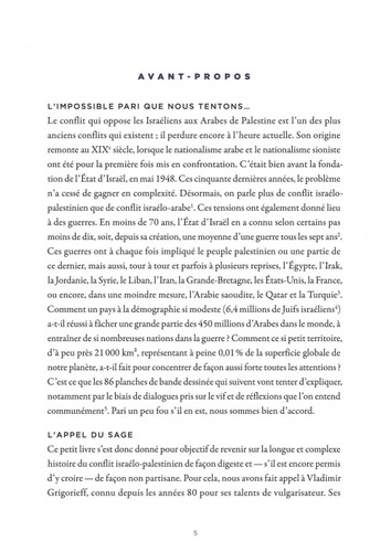 Le peuple judéo-israélien a réussi la restauration de son indépendance nationale qui met fin à deux mille ans d'exil, d'impuissance et à l'inimaginable Shoah ("catastrophe" en hébreu). Le peuple palestinien, autochtone, est entré dès le début en résistance devant la menace du sionisme politique. La Nakba ("catastrophe" en arabe) scella son destin et l'impossible retour en ses foyers. L'Histoire, toujours imprévisible et pour l'heure inachevée, prendra-t-elle enfin la voie de compromis raisonnables ? Cette bande dessinée met en lumière toute la complexité de la question.