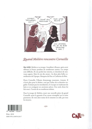 Quand Molière rencontre Corneille Mai 1658. Molière et sa troupe s'installent à Rouen, après avoir sillonné la France pendant de nombreuses années. Les temps sont difficiles. Ils ont perdu leur mécène, et cherchent de nouveaux appuis. Mais ils ont des atouts : les deux plus belles comédiennes de l'époque, Marquise du Parc et Catherine de Brie. Pierre Corneille, l'illustre dramaturge rouennais, s'ennuie. Il écrit plus pour le théâtre, vexé par l'échec de sa dernière tragédie. Goûtant peu les mondanités, il s'occupe en traduisant du latin et en corrigeant ses anciennes pièces. Une seule chose lui fait souci : l'avenir de ses nombreux enfants. Pour la croupe de Molière, jouer une nouvelle pièce du grand Corneille serait la garantie d'un retour triomphal sur la scène parisienne. Ils vont alors tenter de le remettre en selle, par tous les moyens.