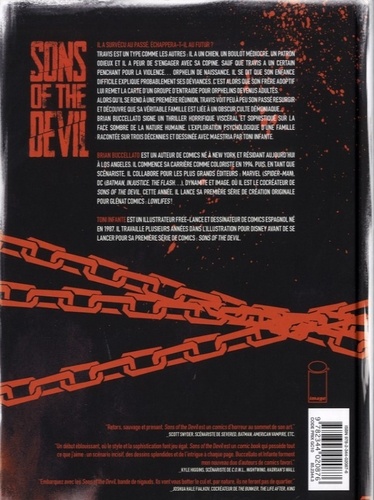 Travis est un type comme les autres : il a un chien, un boulot médiocre, un patron odieux et il a peur de s'engager avec sa copine. Sauf que Travis a un certain penchant pour la violence. Orphelin de naissance, il se dit que son enfance difficile explique probablement ses déviances. C'est alors que son frère adoptif lui remet la carte d'un groupe d'entraide pour orphelins devenus adultes. Alors qu'il se rend A une première réunion, Travis retrouve son passé et découvre que sa véritable famille est liée A un obscur culte démoniaque...Brian Buccellato signe un thriller horrifique viscéral et sophistiqué sur la face sombre de la nature humaine. L'exploration psychologique d'une famille racontée sur trois décennies et dessinée avec maestria par un Toni Infante en héritier direct de Sean Murphy. Sons of the Devil, ou la rencontre entre True Detective et Orphan Black.