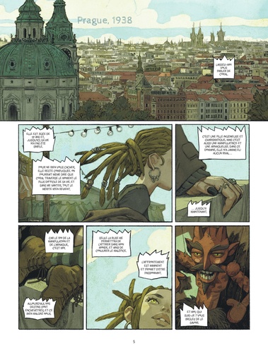 Prague, 1938. L'Europe sombre peu à peu dans la haine et l'intolérance, et une nouvelle guerre mondiale semble inévitable. A la tête de ce chaos, un certain Hitler, que d'aucuns disent guidé par le Diable lui-même. Et si ce n'était pas qu'une simple métaphore ? Lucifer, retenu à la surface contre son gré, erre dans les rues de la capitale tchécoslovaque, incapable de retourner en enfer. La clé de sa liberté réside en Coral, une jeune fille juive à l'esprit vif, seule capable de le voir. Une étrange cohabitation s'installe alors entre eux. Chacun devra user de ruse et d'ingéniosité pour trouver une parade au maléfice qui l'empêche de se débarrasser de l'autre. Mais quel est ce lien énigmatique qui les unit ? Serait-il lié au passé du père de Coral, l'énigmatique rabbin Loew ? Dans son premier album en tant qu'auteur complet, Homs nous plonge dans une Prague sombre et mystérieuse, où s'affronte un Diable manipulateur et une héroïne aussi charismatique que futée. Le Diable et Coral témoigne du talent de Homs pour mêler une narration captivante à un univers graphique éblouissant.