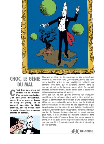 C'est l'un des pires criminels de la planète. L'un des plus mystérieux, aussi. Son nom sonne comme un coup de poing. Et sa société secrète, la Main Blanche, est de celles dont la seule évocation provoque crainte et terreur. Choc est un génie. Un de ces génies du Mal qui amènent le crime au niveau de l'art, grâce à une intelligence brillante qui confond tous ceux qui le traquent, partout dans le monde, et qui ne lui laissent aucun répit. Choc est l'un de ces grands criminels qui marquent durablement la mémoire. C'est qu'il a bien soigné son image, à commencer par son look d'une exceptionnelle élégance, reconnaissable entre tous et par la théâtralisation spectaculaire de ses forfaits. En frappant toujours plus fort, en visant toujours plus haut, il s'est imposé de manière indélébile dans l'imaginaire collectif. Les trois récits qui composent ce premier volume de l'intégrale thématique des aventures de Tif et Tondu nous permettent donc de revivre les débuts d'une des rares véritables icônes du crime. Ne pouvait-on rêver meilleur prélude à la (très attendue) réédition de ce grand classique de la bande dessinée ? Ce premier volume comprend : La Main blancheLe retour de ChocPassez Muscade ... et un dossier inédit !