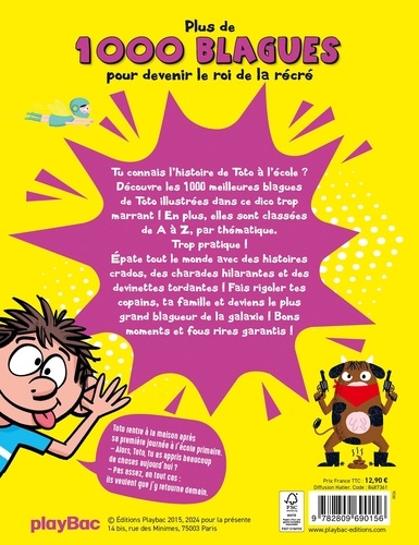 Plus de 1000 blagues pour devenir le roi de la récré ! Tu connais l'histoire de Toto à l'école ? Découvre les 1000 meilleures blagues de Toto illustrées dans ce dico trop marrant ! En plus, elles sont classées de A à Z, par thématique. Trop pratique ! Epate tout le monde avec des histoires crados, des charades hilarantes et des devinettes tordantes ! Fais rigoler tes copains, ta famille et deviens le plus grand blagueur de la galaxie ! Bons moments et fous rires garantis ! Dès 7 ans.