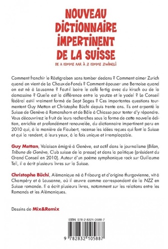 Comment franchir le Röstigraben sans tomber dedans ? Comment aimer Zurich quand on vient de La Chaux-de-Fonds ? Comment épouser une Bernoise quand on est né à Lausanne ? Faut-il boire le café fertig avec du kirsch ou de la damassine ? Quelle est la différence entre la youtze et le yodel ? Le Conseil fédéral est-il vraiment formé de Sept Sages ? Ces importantes questions tourmentent Guy Mettan et Christophe Büchi depuis trente ans. Ils ont arpenté la Suisse de Genève à Romanshorn et de Bâle à Chiasso pour tenter d'y répondre. Vous découvrirez le fruit de leurs recherches sous la forme de cette nouvelle édition, enrichie et profondément renouvelée, du Dictionnaire impertinent paru en 2010 qui, à la manière de Flaubert, recense les idées reçues qui font la Suisse et qui la rendent, à leurs yeux, à la fois unique et irremplaçable.