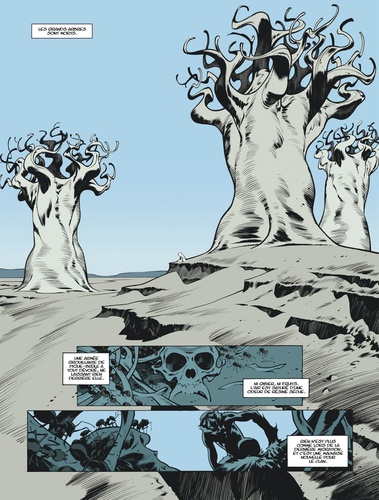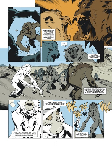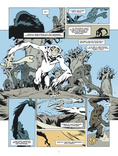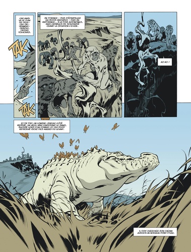 Remontez jusqu'à l'ère lointaine du Déluge, celle qu'évoquent à demi-mots tous les textes anciens de l'humanité... En ces temps de famine, Sans-Voix, un jeune singe orphelin, cherche à prouver sa valeur à son clan d'adoption en chassant le "longue-gueule", un vieil alligator blessé et vicieux. Manger ou être mangé : le cycle immuable de la nature. Mais en osant s'aventurer au coeur des terres interdites, celles des humains, Sans-Voix sera confronté au plus cruel des destins : voir les siens massacrés sous ses yeux avant d'être capturé puis dressé dans les arènes de l'Empire afin de devenir un "Dieu-Fauve", un guerrier sacré façonné pour la violence et l'art du combat. Mais ces longues années de souffrance auront surtout fait grandir en lui une brûlante obsession : se venger de ses bourreaux, quel qu'en soit le prix. Récit de bruit et de fureur, empreint d'une poésie sauvage, Le Dieu-Fauve dresse le portrait d'une civilisation soudainement confrontée à la perspective de sa disparition. Mettant les nerfs à vif, cet album donne à voir et à ressentir la violence de la nature, la chaleur étouffante, le bourdonnement des insectes, les cris de rage et les larmes de désespoir des protagonistes, croquant avec force le ballet incessant qui fait s'entrelacer la vie et la mort, le règne animal et l'humanité. Car, au fond, qui est le réel héros de cette histoire ? L'homme ou... l'animal ?