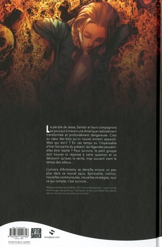 Le périple de Jesse, Sandor et leurs compagnons se poursuit à travers une Amérique radicalement transformée et profondément dangereuse. C'est au coeur des bois qu'un nouvel ennemi apparaît. Mais qui est-il ? En ces temps où l'impensable d'hier fait partie du présent, les légendes peuvent-elles être réalité ? Pour survivre, le petit groupe doit trouver la réponse à cette question et va découvrir qu'avec la vérité, trop souvent vient le temps des adieux... L'univers d'Animosity se densifie encore un peu plus dans ce nouvel opus. Spiritualité, instinct, nouvelles communautés, nouvelles stratégies, tout ce qui compte, c'est survivre...