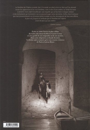 Des événements surnaturels ont lieu à l'Opéra : le grand lustre s'effondre pendant une représentation et tue une spectatrice, un machiniste est retrouvé pendu... La direction doit se rendre à l'évidence : un fantôme ou un homme machiavélique nommé Erik hante le théâtre. Certains affirment avoir vu le visage déformé de cet individu qui ne semblerait pas être humain. Peu après, les directeurs de l'Opéra se voient réclamer 20000 francs par mois de la part d'un certain "Fantôme de l'Opéra" qui exige aussi que la loge numéro 5 lui soit réservée. Dans les coulisses de l'opéra, le vicomte Raoul De Chagny est épris de Christine, une jeune chanteuse lyrique. Mais il ne supporte pas de l'entendre parler avec un autre mystérieux prétendant, à la voix lugubre, fantomatique... Après le succès L'Enfer de Dante, Don Quichotte de Cervantès mais aussi Boris Vian et Balzac, Paul et Gaëtan Brizzi s'attaquent de nouveau à un classique de la littérature. Le Fantôme de l'opéra nous mène dans le Paris de 1890. Le Paris du XIX ? , le cadre de l'opéra Garnier et cette histoire fantastique créent une bande dessinée délicieuse, où s'enchaînent les morceaux de bravoure graphiques.