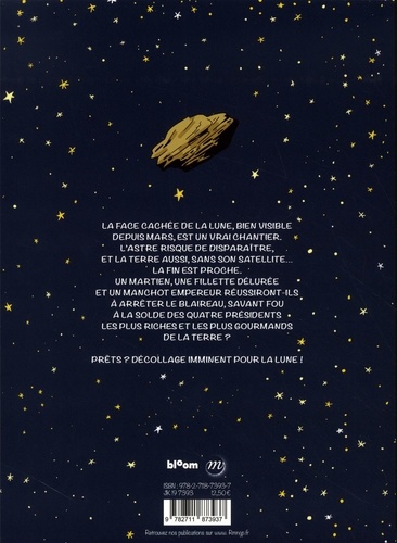 La face cachée de la lune, bien visible depuis mars, est un vrai chantier. L'astre risque de disparaître, et la terre aussi, sans son satellite... La fin est proche. Un martien, une fillette délurée et un manchot empereur réussiront-ils à arrêter le blaireau, savant fou à la solde des quatre présidents les plus riches et les plus gourmands de la terre ? Prêts ? Décollage imminent pour la lune !