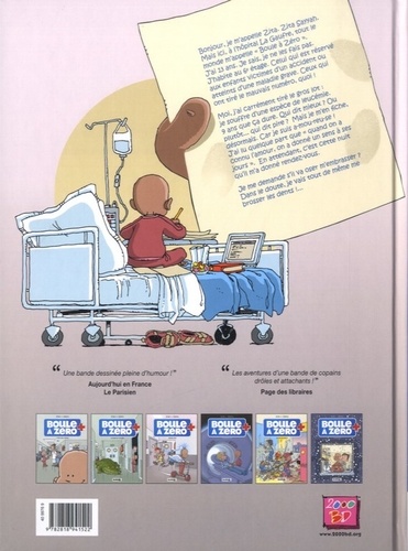 Les aventures pleines d'humour et de tendresse d'une petite fille hospitalisée. Bonjour, je m'appelle Zita. Mais ici, à l'hôpital, tout le monde m'appelle "Boule à Zéro" . J'ai 13 ans et j'habite au 6e étage. Celui qui est réservé aux enfants malades. Ceux qui ont tiré le mauvais numéro, quoi ! Moi, j'ai carrément tiré le gros lot : je souffre d'une leucémie. 9 ans que ça dure. Qui dit mieux ? Ou, plutôt... qui dit pire ? Mais je m'en fiche, désormais. Car je suis a-mou-reu-se ! J'ai lu quelque part que "quand on a connu l'amour, on a donné un sens à ses jours" . Je me demande quand même s'il va oser m'embrasser ? Dans le doute, je vais me brosser les dents ! ...