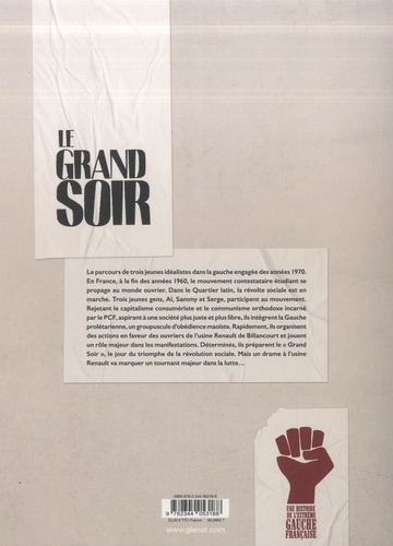 Le parcours de trois jeunes idéalistes dans la gauche engagée des années 70. En France, à la fin des années 60, le mouvement contestataire étudiant se propage au monde ouvrier. Dans le Quartier latin, la révolte sociale est en marche. Trois jeunes gens, Al, Sammy et Serge, participent au mouvement. Rejetant le capitalisme consumériste et le communisme orthodoxe incarné par le PCF, aspirant à une Société plus juste et plus libre, ils intègrent la Gauche prolétarienne, un groupuscule d'obédience maoïste. Rapidement, ils organisent des actions en faveur des ouvriers de l'usine Renault de Billancourt et jouent un rôle majeur dans les manifestations. Déterminés, ils préparent le " Grand Soir ", le jour du triomphe de la révolution sociale. Mais un drame à l'usine Renault va marquer un tournant dans la lutte : l'assassinat à bout portant d'un camarade, Pierrot. L'escalade de la violence va mener la Gauche Prolétarienne à s'autodissoudre en 1973, avec un constat implacable : l'impossibilité de faire bouger les lignes. Pendant cette période politique trouble, chacun va prendre un chemin différent. Tandis que Serge rejoint la rédaction du journal Libération, Al et Sammy vont refuser de voir mourir leurs idéaux... Par les auteurs des Mystères de la République et d'Affaires d'Etat, Le Grand Soir est avant tout un grand cri de révolte, celui d'une jeunesse que le pouvoir refuse d'entendre. En forte résonance avec l'actualité, ce roman graphique à mi-chemin entre le récit historique et le polar s'attarde sur une page importante mais peu connue de notre histoire en nous invitant à suivre le parcours de trois jeunes idéalistes.
