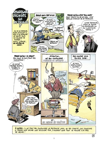 Le guide indispensable à tous les retraités et à ceux qui vont le devenir dans les quarante prochaines années. Parlons clairement : la vie de l'homme moderne commence à soixante-cinq ans, au moment où il cueille les fruits bien mérités de longues années de labeur. Habitué au stress et aux multiples pressions, l'ex-salarié risque d'être perturbé dans cette nouvelle vie, au point de continuer à se lever à 7h30, de mettre une cravate pour aller chercher les croissants ou pire, d'oublier de faire la sieste ! Heureusement, Tybo et Goupil sont là pour guider nos premiers pas dans ce monde étrange de la paresse et du repos. Le Guide de la retraite en BD définit les nouvelles obligations et les nouveaux interdits, p ropose des emplois du temps et offre mille et une astuces pour désapprendre à travailler.