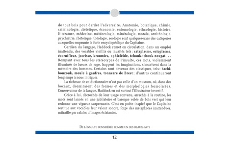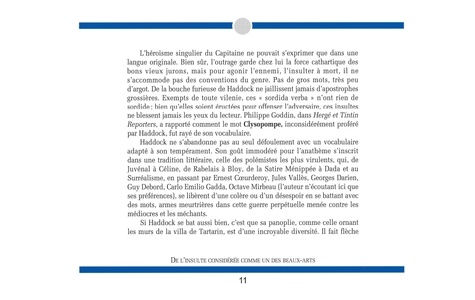L'héroïsme singulier du Capitaine ne pouvait s'exprimer que dans une langue originale. Bien sûr, l'outrage garde chez lui la force cathartique des bons vieux jurons, mais pour agonir l'ennemi, l'insulter à mort, pas de gros mots, très peu d'argot, jamais d'apostrophes grossières. Ces "sordida verba" n'ont rien de sordide. Haddock s'inscrit dans la tradition des polémistes les plus virulents, qui, de Rabelais à Vallès, Bloy ou Céline, se battent avec des mots contre les médiocres et les méchants. Grâce à lui, remis en circulation, décrochés de leur usage convenu, arrachés à la routine, ces mots - dont certains, comme "bachi-bouzouk" ou "tonnerre de Brest", sont devenus des classiques - sont lancés en un jubilatoire et baroque mouvement qui leur donne une vigueur surprenante. Le Haddock illustré est à la fois un lexique donnant signification et emploi des termes haddockiens et un instrument culturel présentant explications historiques et étymologiques, modifications de sens, archaïsmes, régionalismes et haddockismes. Insultes, injures, jurons : pour la première fois, tout l'arsenal des "mots" du Capitaine est présenté et analysé avec autant de sérieux que d'humour.