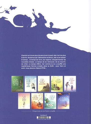 Une " feel-good " BD pleine d'optimisme ! Chantal ne trouve plus de sens à son travail, elle n'arrive plus à écrire. Soutenue par Clémentine et Simon, elle va se laisser le temps... le temps de vivre, de respirer, d'expérimenter de nouvelles choses. Le temps de se retrouver, de se nourrir, de créer. Le temps d'être. Car comme le lui a soufflé une mystérieuse femme croisée dans la forêt : pour faire et avoir, nous devons d'abord ETRE...