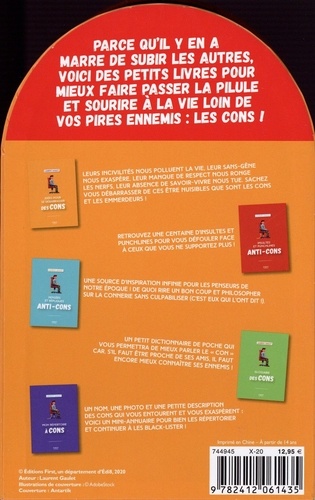 Enfin un kit pour se débarrasser des cons ! Parce qu'il y en a marre de subir les autres, voici des petits livres pour mieux faire passer la pilule et sourire à la vie - loin de vos pires ennemis : les cons ! - Les meilleures idées pour se débarrasser des cons Voici plein d'idées pour vous faciliter la vie ! - Les insultes et punchlines anti-cons De quoi vous défouler face à ceux que vous ne supportez plus ! - Les pensées et citations sur les cons De quoi rire un bon coup ! - Le glossaire anti-cons Un petit dictionnaire de poche qui vous permettra de mieux parler le " con " car, s'il faut être proche de ses amis, il faut encore mieux connaître ses ennemis ! - L'annuaire à cons Pour bien les répertorier et continuer à les black-lister !