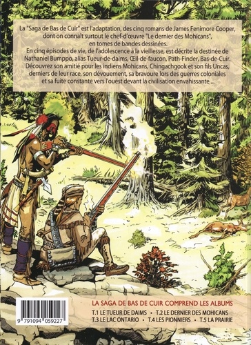 La "Saga de Bas de Cuir" est l'adaptation, des cinq romans de James Fenimore Cooper, dont on connaît surtout le chef-d'oeuvre "Le dernier des Mohicans", en tomes de bandes dessinées. En cinq épisodes de vie, de l'adolescence à la vieillesse, est décrite la destinée de Nathaniel Bumppo, alias Tueur-de-daims, OEil-de-faucon, Path-Finder, Bas-de-Cuir. Découvrez son amitié pour les indiens Mohicans, Chingachgook et son fils Uncas, derniers de leur race, son dévouement, sa bravoure lors des guerres coloniales et sa fuite constante vers l'ouest devant la civilisation envahissante S'appuyer sur une juste connaissance de notre sensibilité pour vivre en être libre de suivre sa vocation.