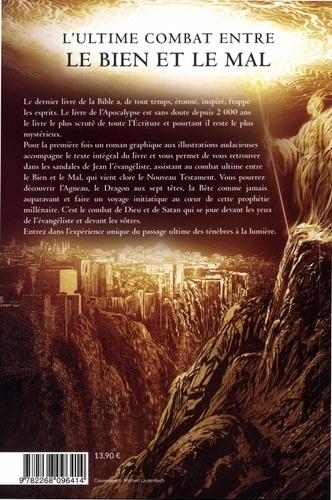 Le dernier livre de la Bible a, de tout temps, étonné, inspiré, frappé les esprits. Le livre de l'Apocalypse est sans doute depuis 2 000 ans le livre le plus scruté de toute l'Ecriture et pourtant il reste le plus mystérieux. Pour la première fois un roman graphique aux illustrations audacieuses accompagne le texte intégral du livre et vous permet de vous retrouver dans les sandales de Jean l'évangéliste, assistant au combat ultime entre le Bien et le Mal, qui vient clore le Nouveau Testament. Vous pourrez découvrir l'Agneau, le Dragon aux sept têtes, la Bête comme jamais auparavant et faire un voyage initiatique au coeur de cette prophétie millénaire. C'est le combat de Dieu et de Satan qui se joue devant les yeux de l'évangéliste et devant les vôtres. Entrez dans l'expérience unique du passage ultime des ténèbres à la lumière.