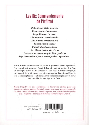 Les Dix Commandements de l'Infiltré : De honte parfois tu mourras ; De mensonges tu abuseras ; De paillettes tu t'orneras ; L'humour ton arme deviendra ; A ta place tu ne resteras pas ; La séduction tu useras ; L'admiration tu susciteras ; Du ridicule toujours tu vivras ; Dans tous les cas ton sang froid tu garderas ; Si ça devient chaud, à ton cou tes jambes tu prendras ! Futur Infiltré, tu tiens entre tes mains le guide qui va changer ta vie. Son pouvoir est immense. Avant de l'ouvrir, soit sûr de toi. Il te faut un coeur pur et des mains innocentes. Une fois l'Infiltration reçue, il est impossible de faire marche arrière sous peine d'être immolé par le feu. Si tu acceptes ces conditions alors à toi les mains pleines, tu seras mon semblable, mon égal, mon frère !