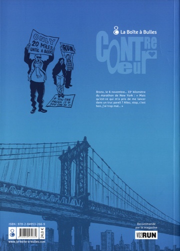 Sédentaire endurci, Sébastien se met tout à coup en tête de courir le marathon de New-York. Tranquille professeur de dessin sédentaire, Sébastien se retrouve parfois "pris au piège" de dîners avec les amis de sa compagne, tous férus de course à pied. Pour lui, qui n'a pas enfilé de chaussures de sport depuis l'adolescence, ces discussions demeurent bien hermétiques. Jusqu'au jour où, au détour d'une conversation, ses amis évoquent la possibilité de courir le plus célèbre marathon du monde : celui de New York. Traversé par un éclair de folie, Sébastien annonce que, cette année, il en sera ! Est-ce seulement par bravade ou parce qu'il entrevoit enfin la possibilité de visiter cette ville qui lui fait de l'oeil depuis des années ? Toujours est-il que les inscriptions approchent et que Sébastien ne compte pas se démonter, même si son organisme grince au bout d'à peine 10 minutes de petites foulées sur le bitume... Un appel au dépassement de soi et à la persévérance, doublé d'une véritable visite guidée de New York !