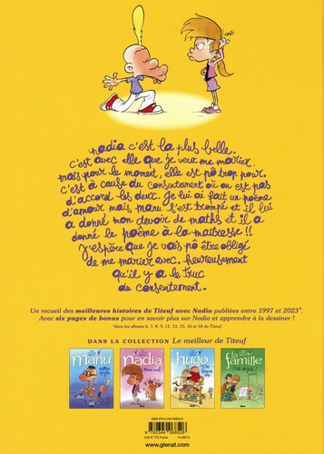 Redécouvrez les personnages phares de la série à travers une nouvelle collection ! Nadia, le grand amour (non réciproque ! ) de Titeuf, est la star incontestée de ce recueil où les baffes, les râteaux et les moments de honte fusent. Titeuf n'a aucun répit et ne prend aucun répit pour chercher à séduire sa belle Nadia comme pour être presque à chaque fois, éconduit. Le cuisant chemin de l'amour quand l'autre n'en a rien à faire de vous ! Dans chaque tome, Le meilleur de Titeuf met en lumière un personnage ou un groupe de personnages cultes de l'univers de Titeuf. Ces recueils d'histoires - publiées dans les albums 7 à 18 - traversent ainsi plus de vingt-cinq ans de création de Zep ! Pour les fans d'hier, d'aujourd'hui et de demain, ils apportent un regard neuf et original, une occasion de (re)découvrir ou d'offrir les meilleures histoires de Titeuf. Chaque recueil s'accompagne d'une couverture originale et de pages bonus, dont un dessin (par Titeuf ! ) du/des personnage/s à l'honneur (Manu, Nadia, Hugo & Co ou La famille), d'un tuto pour apprendre à dessiner le/les personnage/s ainsi que de deux à trois pages d'anecdotes illustrées et de quiz ! De quoi se replonger dans le fascinant univers de la plus célèbre mèche blonde de la BD et retrouver les gags et les rires de la cour d'école.