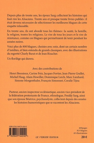 Depuis plus de trente ans, les époux Sarg collectent les histoires qui font rire les Alsaciens. Trente ans et presque trente livres publiésâ : il était devenu nécessaire de sélectionner les meilleures blagues de cette enquête inlassable. En trente ans, ils ont abordé tous les thèmes : la santé, la famille, la religion, toutes les religions. Le rire de tous les jours et le rire de résistance, comme ces blagues qui permettaient de tenir pendant les années noires. Voici près de 500 blagues, choisies avec soin, dont un certain nombre d'inédits, et bien entendu de grands classiques, avec des illustrations du regretté Charly Barat et de Jean Risacher. Un florilège qui durera.