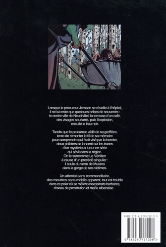 Lorsque le procureur Jemsen se réveille à l'hôpital, il ne lui reste que quelques bribes de souvenirs : le centre-ville de Neuchâtel, la terrasse d'un café, des visages souriants, puis l'explosion. Ensuite, le trou noir. Tandis que le procureur, aidé de sa greffière, tente de remonter le fil de sa mémoire pour comprendre qui était visé par la bombe, deux policiers se lancent sur les traces d'un mystérieux tueur en série qui sévit dans la région. On le surnomme Le Vénitien à cause d'un procédé singulier : il coule du verre de Murano dans la gorge de ses victimes. Un attentat sans commanditaire, des meurtres sans mobile apparent, tout est trouble dans ce polar essoufflant où se mêlent assassinats barbares, corruption politique, réseau de prostitution et mafia albanaiseâ¦