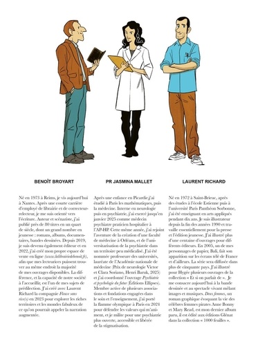 Une exploration lumineuse et sensible de la santé mentale, où une psychiatre, un dessinateur et un écrivain vous invitent à un dialogue profond et décalé sur les troubles psychiques. Entre conversation intime et enquête documentaire, ce roman graphique dessiné par Laurent Richard déjoue les idées reçues sur la psychiatrie. A travers un échange vivant entre Jasmina Mallet, psychiatre spécialiste des neurosciences, et Benoît Broyart, écrivain passionné par les liens entre maladie mentale et création artistique, découvrez une approche à la fois humaine des troubles bipolaires, schizophrénie, autisme : ce livre lève le voile sur ces réalités qui concernent près d'un Français sur cinq. Un parcours initiatique qui mêle histoire de la psychiatrie, témoignages, anecdotes personnelles et réflexions sur notre rapport à la santé mentale. Une bande dessinée à la fois informative et profondément emphatique, qui invite le lecteur à déstigmatiser la maladie mentale et à regarder différemment la souffrance psychique.