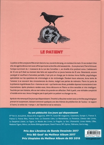 A quoi bon se souvenir qu'on a vécu l'enfer ? La police arrête une jeune fille errant dans la rue, couverte de sang, un couteau à la main. En se rendant chez elle, les agents découvrent avec effroi une scène de massacre : toute sa famille a été assassinée... 6 ans plus tard, Pierre Grimaud, l'unique survivant du " massacre de la rue des Corneilles ", se réveille d'un profond coma. L'adolescent de 15 ans qu'il était au moment des faits est aujourd'hui un jeune homme de 21 ans. Désorienté, encore paralysé et souffrant d'amnésie partielle, il est pris en charge par le docteur Anna Kieffer, psychologue spécialisée sur les questions de criminologie et de victimologie. Pendant leurs séances, Anna tente de l'amener à se souvenir des circonstances du drame, malgré ses pertes de mémoire. Pierre lui évoque la présence mystérieuse d'un " homme en noir " qui hante ses rêves, probable réponse inconsciente à son traumatisme. Après plusieurs rendez-vous, Anna découvre en Pierre un être sensible et très intelligent. Touchée par son histoire, elle se met même à le prendre en affection. Petit à petit, une véritable complicité s'installe entre eux. Anna n'imagine pas à quel point ce patient va changer sa vie... Après le remarqué Ces jours qui disparaissent, Timothé Le Boucher revient avec un ouvrage témoignant une nouvelle fois de sa science narrative exemplaire. S'inscrivant dans une veine plus réaliste, Le Patient est un thriller psychologique prenant et surprenant, laissant entrevoir quelques-uns des thèmes de prédilection de l'auteur : le rapport à l'autre, la notion du " temps ", de l'identité et de la mémoire.