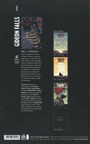 Après un voyage dans le temps et l'espace, Norton et Clare sont piégés dans la a petite ville u de Gideon Falls avec un psychopathe meurtrier. Pendant ce temps, dans une autre dimension, le père Fred et Angie et affrontent l'évêque dans la "grande ville". Gideon Falls et ses secrets n'ont jamais été aussi près d'être révélés. Le vrai combat contre "le centre et celui qui vit dans son ombre" ne fait que commencer. GIDEON FALLS signe les retrouvailles de Jeff LEMIRE (SWEET TOOTH, DESCENDER) et Andrea SORRENTINO (GREEN ARROW) aprés leur passage die. Marvel sur la série Wolverine : Old Man Logan. Dans les pas de David LYNCH, LEMIRE s'aventure pour la première fois en territoire horrifique et confie à SORRENTINO le soin de donne, corps à cette quête du Mal incarné, qu'il hante les campagnes ou se tapisse dans les artères urbaines.