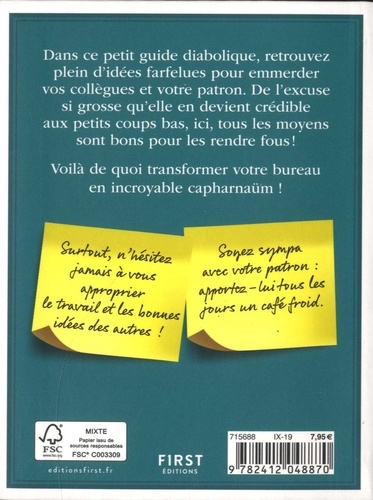 Dans ce petit guide diabolique, retrouvez plein d'idées farfelues pour emmerder vos collègues et votre patron. De l'excuse si grosse qu'elle en devient crédible aux petits coups bas, ici, tous les moyens sont bons pour les rendre fous ! Voilà de quoi transformer votre bureau en incroyable capharnaüm !