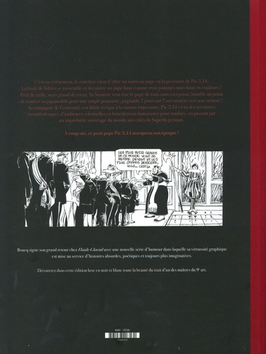 Habemus Papam ! Boucq revient chez Fluide Glacial pour nous présenter le nouveau Pape Pie 3, 14 dans ce tirage de luxe en N&B. Le conclave a élu un nouveau pape en la personne de Pie 3, 14. Mais lors de la présentation à la foule, elle découvre avec stupeur qu'il est fort petit, au point de ne pas dépasser de la barrière du balcon du Vatican. On a vu mieux comme présentation au peuple... Mais cela n'atteint pas le moral débonnaire de ce Petit Pape qui vivra des aventures bien plus rocambolesques au fil des pages, sous l'incroyable plume de Boucq qui revient chez Fluide Glacial avec une série absurde à souhait. Flanqué de Gontrand, son Cardinal / garde du corps (2m10 pour 120 kg), Pie 3, 14 va aller au contact de la population et nous montrer que le quotidien d'un pape est semé d'embûches et de rencontres en tout genre. Après le succès du diptyque Little Tulip / New York Cannibals, Boucq signe son grand retour à l'humour avec une série où la virtuosité graphique est mise au service d'histoires absurdes et toujours plus imaginatives.