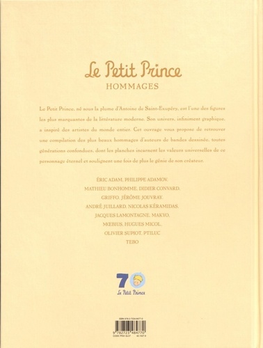 Le Petit Prince, né sous la plume d'Antoine de Saint-Exupéry, est l'un des personnages de la littérature les plus reconnus à travers le monde. Son univers, infiniment graphique, a été maintes fois transposé à l'image – dernièrement dans le magnifique film d'animation de Mark Osborne –, et notamment en bande dessinée. Ce livre vous propose de retrouver une compilation des plus beaux hommages en cases et en bulles réalisés par quelques grands auteurs de la bande dessinée, toutes générations confondues : de Mœbius à Tebo, en passant par Griffo, Mathieu Bonhomme ou Makyo... Des interprétations sous forme d'histoires courtes de 2 à 4 pages, aussi réussies que variées, d'un personnage mythique de la littérature française et internationale.
