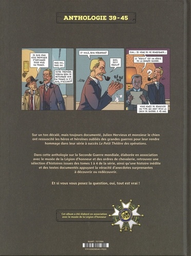 Sur un ton décalé, mais toujours documenté, Julien Hervieux et monsieur le chien ont ressuscité les héros et héroïnes oubliés des grandes guerres pour leur rendre hommage dans leur série à succès Le Petit Théâtre des opérations. Dans cette anthologie sur la Seconde Guerre mondiale, élaborée en association avec le musée de la Légion d'honneur et des ordres de chevalerie, retrouvez une sélection d'histoires issues des tomes 1 à 4 de la série, ainsi qu'une histoire inédite et des textes documentés appuyant la véracité d'anecdotes surprenantes à découvrir ou redécouvrir. Et si vous vous posez la question, oui, tout est vrai !