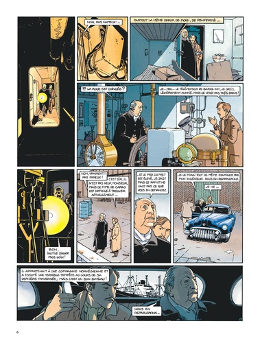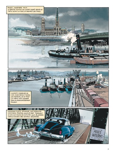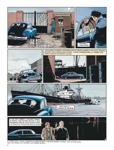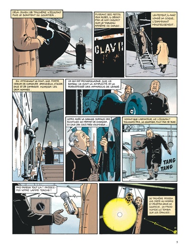 Rouen 1949. L'armateur Julien de Trichère achète un vieux cargo américain, l'Olav II, qu'il rebaptise la Belle Hélène - sa fille s'appelle Hélène et il l'adore. Yann Calec, jeune commandant sans bateau ni équipage, fait des pieds et des mains auprès d'Ester, la secrétaire de l'armateur, pour se faire engager. Non seulement il y arrive un peu trop facilement, mais on lui donne pour second un certain René Floss, qui traîne derrière lui un passé extrêmement louche. Décidément, Calec se méfie : quelque chose se trame sur ce rafiot pourri dont on refait à neuf les cabines et sanitaires, sans s'intéresser le moins du monde à l'état calamiteux de ses chaudières. Amour dévorant d'un père condamné pour sa fille infirme, escroquerie à l'assurance, complicité d'un nazi parti cultiver sa nostalgie au Venezuela - Calec est effectivement tombé dans un piège, dont la première victime est Ester, qu'il aimait et qu'il a, sans le vouloir, envoyée à l'abattoir. Et c'est l'âme en peine qu'un jour de brouillard, il quitte Rouen sur la Belle Hélène. Sortira-t-il vivant du piège ? Vous le saurez dans le prochain épisode, le Bateau assassiné. Poésie des ports, grisaille des docks et froideur des âmes, personnages attachants ou inquiétants - Kraehn et Jussaume font passer, à travers l'élégance du dessin et la solidité discrète du scénario, un parfum de roman noir grand cru.