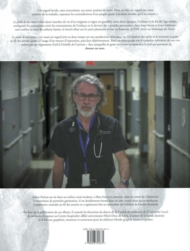 "Un regard lucide, sans concessions, sur notre système de santé. Non, en fait, un regard sur notre système de la maladie, exposant les contradictions d'un peuple quant à la santé durable qu'il se consent." Le poids de nos traces relate deux tranches de vie d'un soignant et signe un parallèle entre deux époques, l'enfance et la fin de l'âge adulte, soulignant les connexions entre les traumatismes de l'enfance er le devenir des "grandes personnes", dans leurs forces et leurs faiblesses ; sans oublier la trace de carbone laissé, le lourd tribut sur la santé planétaire d'une vie humaine au XXIe siècle en Amérique du Nord. Le poids de nos traces, c'est aussi un regard jeté en deux temps sur une production artistique, sur l'évolution des styles et la maturité acquise au fil des années quant à l'usage d'un moyen d'expression, puis leur dépérissement. Bref, un témoignage sur le caractère éphémère de nos vies - même pas un clignement d'oeil à l'échelle de l'univers - face auxquelles le geste artistique est peut-être le seul qui permette de donner un sens.