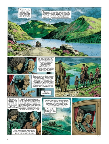 Le Portrait d'Amelia, 1er tome d'Highlands, un diptyque signé Aymond, s'ouvre sur le retour du peintre écossais Joseph Callander sur ses terres natales ; ce dernier, bien loin des rivalités qui opposent Anglais et Ecossais, aspire à une existence tranquille, vouée à son art... Highlands, résumé du 1er épisode. Août 1743, le duc de Plaxton, un riche Ecossais qui a choisi de s'allier aux Anglais, prend le peintre Joseph Callander à son service. Le duc ne se doute pas que cet acte aura de tragiques conséquences pour son fils, William, hostile à ses engagements politiques, et, surtout, pour sa fille, Amelia. Malgré sa prudence, Joseph est victime d'un piège et se trouve accusé d'avoir dissimulé des dessins dévoilant un détail intime d'Amelia... Arrêté, puis gravement blessé, il parvient à s'enfuir et à se réfugier dans les Highlands, bien décidé alors à retrouver son honneur et sa liberté ! Avec ce premier volet d'Highlands, une bande dessinée d'aventures tout public, Aymond signe pour la première fois un récit complet.