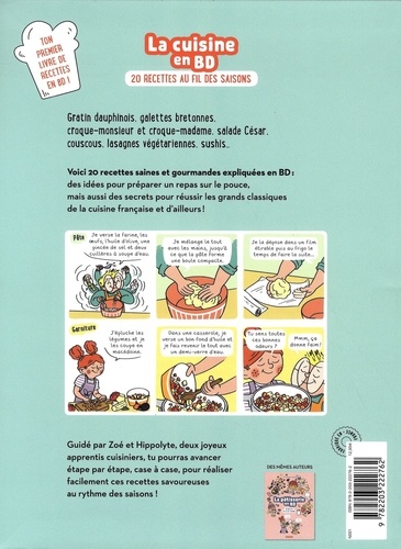 Grâce à cette bande dessinée, découvrez vingt recettes à faire toute l'année : des repas à manger sur le pouce (croque-monsieur et croque-madame, soufflés, oeufs cocotte et mimosa, salade césar...), des grands classiques (quiche, galettes bretonnes, soupe, fajitas, lasagnes végétariennes, pizzas...) et des recettes dignes d'un grand chef, pour épater toute sa famille (sushis, papillotes surprises, gratin de ravioles...) ! Cinq recettes par saison, des incontournables aux plus originales, des plus simples aux plus complexes réalisées étape par étape par Zoé et son petit frère Hippolyte, deux apprentis cuistots aussi enthousiastes que limpides dans leurs explications.