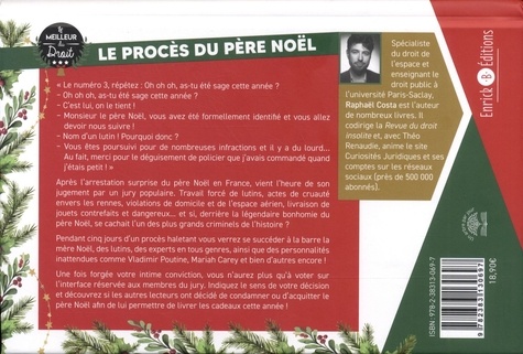 Condamnerez vous le Père Noël ? Après l'arrestation surprise du Père Noël en France, il est l'heure pour lui d'être jugé par un jury populaire. Travail forcé de lutins, actes de cruauté envers les rennes, violations de domicile et de l'espace aérien, contrefaçons et produits défectueux, ... et si derrière la légendaire bonhomie du père Noël se cachait l'un des plus grands criminels de l'histoire ? Pendant cinq jours d'un procès haletant et déluré, écoutez se succéder à la barre la Mère Noël, des lutins, des experts médicaux mais aussi des personnalités inattendues telles que Vladimir Poutine, Mariah Carrey et bien d'autres encore ! Une fois forgée votre intime conviction, vous n'aurez plus qu'à voter sur l'interface réservée aux membres du jury. Indiquez le sens de votre décision et découvrez si les autres lecteurs ont décidé de condamner ou d'acquitter le Père Noël afin de lui permettre de livrer les cadeaux cette année !