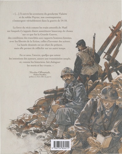 " [...] A suivre les aventures du gendarme Vialatte et du soldat Peyrac, nos contemporains s'immergent véritablement dans la guerre de 14-18. La force du récit comme les traits attentifs de Maël sur lesquels il s'appuie disent assurément beaucoup de choses sur ce que fut la Grande Guerre, des conditions des tranchées aux rapports hommes-femmes, avec les libertés de la fiction, celles d'inventer des scènes. La bande dessinée est un objet du présent, mais elle permet de réfléchir sur un autre temps. En ce sens, l'oeuvre, quelles que soient les intentions des auteurs, assure une transmission souple, et, comme les historiens, fait dialoguer les morts et les vivants." Nicolas Offenstadt.