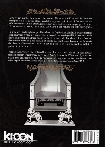 La réinterprétation du Richard III de Shakespeare par Aya Kanno, l'auteur d'Otomen ! Lors d'une partie de chasse donnée en l'honneur d'Edouard V, Richard échappe de peu à un piège mortel : le jeune roi et son frère avaient en effet élaboré tout un stratagème pour qu'il soit tué par sa propre femme ! Heureusement, Anne, qui n'était pas dupe, s'est rangée du côté du régent... Le duc de Buckingham profite alors de l'agitation générale pour accuser le monarque d'être un usurpateur issu d'un mariage illégitime, avant de faire enfermer les deux enfants dans la tour de Londres ! Le trône est désormais libre et plus aucun obstacle ne semble se dresser sur la route du duc de Gloucester... si ce n'est le peuple en colère, qu'il va falloir à présent persuader !