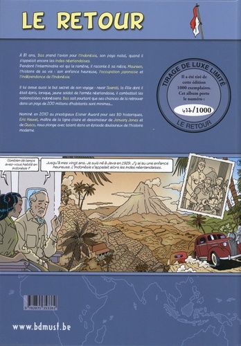 A 81 ans, Bas prend l'avion pour l'Indonésie, son pays natal, quand il s'appelait encore les Indes néerlandaises. Pendant l'interminable vol qui le ramène, il raconte à sa nièce Maureen, l'histoire de sa vie : son enfance heureuse, l'occupation japonaise et l'indépendance de l'Indonésie. Il lui avoue aussi le but secret de son voyage : revoir Soerati, la fille dont il était épris, lorsque, jeune soldat de l'armée néerlandaise, il combattait les nationalistes indonésiens. Bas sait pourtant que ses chances de la retrouver dans un pays de 200 millions d'habitants sont minimes. Nominé en 2010 au prestigieux Eisner Award pour ses BD historiques, Eric Heuvel, maître de la ligne claire et dessinateur de January Jones et de Quaco, nous plonge avec talent dans un épisode douloureux de l'histoire moderne.