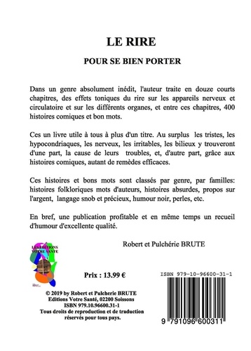 LE RIRE POUR SE BIEN PORTER Dans un genre absolument inédit, l'auteur traite en douze courts chapitres, des effets toniques du rire sur les appareils nerveux et circulatoire et sur les différents organes, et entre ces chapitres, 400 histoires comiques et bon mots. Ces un livre utile à tous à plus d'un titre. Au surplus les tristes, les hypocondriaques, les nerveux, les irritables, les bilieux y trouveront d'une part, la cause de leurs troubles, et, d'autre part, grâce aux histoires comiques, autant de remèdes efficaces. Ces histoires et bons mots sont classés par genre, par familles : histoires folkloriques mots d'auteurs, histoires absurdes, propos sur l'argent, langage snob et précieux, humour noir, perles, etc. En bref, une publication profitable et en même temps un recueil d'humour d'excellente qualité.