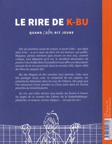 Dès ses premiers coups de crayon, le jeune Cabu - qui signe alors K-bu - a eu à coeur de faire rire ses lecteurs, son public. Moqueur, jamais méchant (pas encore en tout cas), souvent critique, tout débutant qu'il est, le sémillant dessinateur de presse s'inscrit déjà dans l'actualité et nous offre une description amusée de la vie provinciale dans les années 1950, digne reflet des films de Jacques Tati. Roi des blagues et des canulars tous azimuts, Cabu nous fait partager aussi, avec la complicité de ses copains, ses potacheries hilarantes dans les rues de Châlons. Des gags que l'on retrouvera d'une manière ou d'une autre dans les futures planches du Grand Duduche. Du rire, que Cabu décline sous toutes ses formes à travers les pages de ce numéro des Cahiers de la Duduchothèque : plaisanter, se moquer, ricaner, blaguer... rien que du rire !