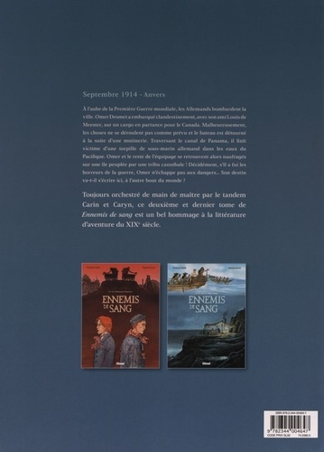 Partir à l'aventure pour rencontrer son destin... Septembre 1914. A l'aube de la Première Guerre Mondiale, les Allemands bombardent Anvers. Omer Desmet a embarqué clandestinement, avec son ami Louis de Meester, sur un cargo en partance pour le Canada. Malheureusement, les choses ne se déroulent pas comme prévu et le bateau est détourné à la suite d'une mutinerie. Traversant le canal de Panama, il finit victime d'une torpille de sous-marin allemand dans les eaux du Pacifique. Omer et le reste de l'équipage se retrouvent alors naufragés sur une île peuplée par une tribu cannibale ! S'il a fui les horreurs de la guerre, Omer n'échappe pas pour autant aux dangers... Son destin va-t-il s'écrire ici, à l'autre bout du monde ? Toujours orchestré par le tandem Carin et Caryn, ce second tome de Ennemis de Sang est un bel hommage à la littérature d'aventure du XIXe siècle.