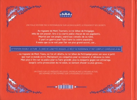 Au royaume de Mont-Tournure, le roi Jéhan de Potiguigni, imbu de son pouvoir, tire à La courte paille chacun de ses jugements. Méprisé par son peuple, sourd aux conseils de sa reine, il part en guerre pour faire taire la colère populaire. A moins que ce ne soit pour fuir son plus grand secret, car... au royaume de Mont-Tounu, où l'on vit dévêtu, le roi Jéhan de Petitquiqui pense son sexe si petit que tout le monde en rit. Multipliant les conquêtes pour se rassurer, il délaisse la reine. Mais plus il tire sur sa paille pour la faire grandir, plus la moquerie gagne son entourage. Jusqu' à cette provocation du roi voisin, se vantant d'avoir la plus grosse... Attention double lecture à l'aide de lunettes rouges, le récit se modernise et met corps et complexes à nu.