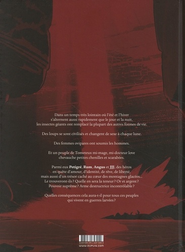 Dans un monde où les jeunes loups peuvent changer de sexe avant de choisir leur identité définitive, Petigré, héritier du trône, a décidé de rester louve. Une décision qu'elle a assortie, par soif d'aventure, d'une chasse au trésor avec une bande composée de Rum, son amoureux humain, du Tometeux, un lutin facétieux et d'un Sanzame, un zombie dévoué. Poursuivi·e par les sbires de Kourgane, qui veut lui ravir le trône, Petigré va se trouver piégé·e lors d'une terrible avalanche, puis dans un mystérieux domaine caché au coeur de la montagne... De quoi peut-être réveiller son Sanzame... Pendant ce temps, les humaines, devenues ovipares et forcées de donner à chaque lune deux de leurs oeufs aux loups en gage de paix, décident de leur tendre un piège sous l'égide de la Générale Trycia. Un coup d'éclat qui pourrait bien faire de l'ombre à sa maîtresse l'Impératrice, jalouse de ses pouvoirs et de ses secrets, dont certains concernent la bande de Petigré... Emilie Alibert et Denis Lapière réinventent la teen fantasy avec Le Roi Louve, une histoire d'amour, d'aventures et de complots qui prend les jeunes lecteurs pour ce qu'ils sont : des amateurs exigeants !