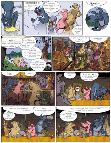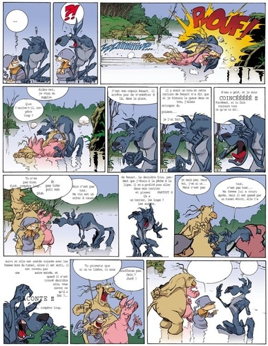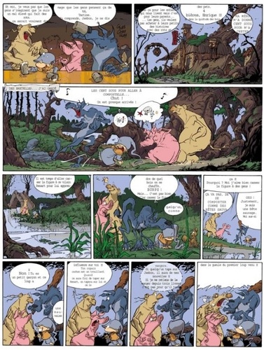 Comme nous sommes au Moyen Age, les forêts sont plus vastes et profondes qu'aujourd'hui, et nul n'ose s'y aventurer. Néanmoins, Merlin, Tartine et Jambon, qui ne sont pas "nuls", s'y aventurent. Mais d'abord, rappelez-vous. Merlin, c'est Merlin enfant - un gosse plutôt vilain et mal élevé, sous son joli chapeau bleu. Jambon, c'est le cochon, et Tartine, c'est l'ogre qui ne mange plus d'enfants, mais qui se retient de bouffer Jambon depuis trois albums. Dans la forêt, ils trouvent le loup Ysengrin en mauvaise posture, la queue prise dans la glace : il s'est encore fait avoir par son copain Renart le goupil, qui est beaucoup plus futé que lui. Après délivrance du loup, les quatre compères foncent chez Renart lui casser la gueule. Mais décidément, Renart est très futé... Nous sommes donc en plein Roman de Renart - la série originelle ayant été écrite aux XIIe et XIIIe siècles -, version Sfar et Munuera, c'est-à-dire iconoclaste. Avec quelques digressions rigolotes sur le déterminisme et la liberté de chacun (en particulier de l'auteur), l'incident du virtuel sur le destin des personnages, et le droit (ou non) de zigouiller ce salopard de Renart - un personnage du patrimoine, autant dire une légende. Sans oublier quelques détours par les Trois Petits Cochons et La Fontaine. Le tout se lit au premier degré pour les enfants, et au deuxième degré pour les grands, qui sont beaucoup plus cultivés, ça va de soi. Ce qui n'est pas sans rappeler le cas Astérix. Une merveille de loufoquerie et d'impertinence, tant sur le plan de l'imaginaire que du graphisme. Et bientôt, nous retrouverons les trois copains dans Tristan et Iseult. Ca promet.