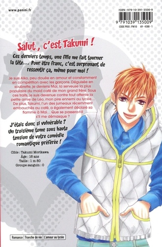 "Je suis Aiko, pas très douée en amour et constamment en compétition avec les garçons. Déguisée en soubrette diablotine, je deviens Mai, la serveuse la plus populaire du maid café de mon grand-frère ! Sous ces traits, je suis, contre toute attente, devenue la petite amie de Léo, mon pire ennemi au lycée. Notre relation doit donc rester secrète. Depuis peu, les jumeaux Ikumi et Takumi, ont intégré l'équipe du maid café, et Takumi n'a pas attendu longtemps pour déclarer sa flamme à Mai devant les yeux d'un Léo furieux. Que se passera-t-il s'il me reconnaît, moi, sa nouvelle camarade de classe ? "