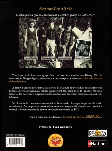 Septembre 1940, quatre jeunes garçons découvrent la célèbre grotte de Lascaux. C'est à partir de leur témoignage direct et avec leur caution que Thierry Félix, le scénariste, et Philippe Bigotto, le dessinateur, ont entrepris de raconter la plus belle histoire de la préhistoire. Le dessin d'abord noir et blanc, puis enrichi de couleurs pour restituer la splendeur des peintures préhistoriques, nous replace visuellement dans l'ambiance de l'époque. Mêlés au scénario, des documents originaux inédits ajoutent une dimension didactique au plaisir de la lecture. Cet album se lit comme une aventure dont l'exactitude historique lui permet de servir de référence. On ne pouvait mieux saluer cette extravagante découverte où la réalité a dépassé la fiction au point de devenir un excellent scénario de BD ! C'est à votre tour de découvrir le secret des bois de Lascaux...