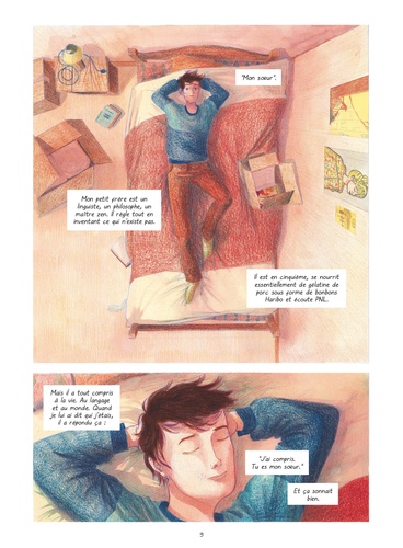 " Les mots sont essentiels, quelque chose qu'on ne nomme pas n'existe pas ... " En première année de fac, Léold vient d'emménager à Bordeaux. Au même moment il démarre sa prise d'hormones. Car Léold est une personne non-binaire, ni complètement fille, ni complètement garçon. Léold revendique sa " fluidité " et ne regrette rien. Il vit un entre-deux... Face à cette situation ses parents sont un peu perdus. Ils pourraient comprendre un changement de genre mais la " fluidité " ? Heureusement, les amis sont bienveillants. En attendant, Léold doit s'atteler aux cartons dans un appartement en vrac. Pour se détendre, il prend des bains et va à la piscine où le maître-nageur le regarde d'un oeil curieux. Peu importe, Léold se sent bien tel qu'il est. Bientôt, un imprévu va venir bousculer son quotidien. Un imprévu ... qui s'appelle Olivia. C'est sa voisine. Au fil des échanges, une certaine complicité va se nouer entre eux. Olivia va le suivre dans ce parcours de transition, discuter, écouter et débattre. Ensemble, ils vont chercher les mots justes et surtout vivre librement leur histoire naissante. Face au regard d'une Société binaire qui évolue, Léold est en mouvement perpétuel. Il se réinvente chaque jour, il éclate de rire, se questionne, s'habille comme il le souhaite, met du vernis sur ses orteils, marche loin devant... Ce roman graphique touchant met en lumière un personnage fort affirmant son identité genderfluid et ouvre le dialogue en réinterrogeant la langue française. Avec ses dessins délicats et des couleurs solaires à l'image de Léold, Marion Cluzel sublime le récit de l'écrivaine Séverine Vidal.
