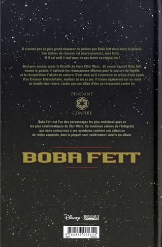 Il n'existe pas de plus grand chasseur de primes que Boba Fett dans toute la galaxie. Son tableau de chasses est impressionnant, sans faille... Et il est prêt à tout pour ne pas ternir sa réputation ! Quelques années après la Bataille de Yavin (Star Wars : Un nouvel espoir) Boba Fett écume la galaxie. Il collecte les récompenses offertes pour la capture de fugitifs et la récupération d'objets de valeurs. C'est ainsi qu'il s'aventure au milieu d'une épave d'un Croiseur Interstellaire, mettant sa vie en jeu. Il trouve également sur sa route un double bien retors, tandis que ses alliés d'hier se retournent contre lui. Boba Fett est l'un des personnages les plus emblématiques et les plus charismatiques de Star Wars. Ce troisième volume de l'Intégrale que nous consacrons à ses aventures contient une sélection de récits complets, dont la plupart sont entièrement inédits en album.
